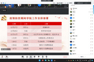 王小兵谈到,当前西安疫情拐点已经出现,但仍处于防控工作的攻坚期,高等院校作为重点,关系到全市疫情防控的大局。全体教师在做好自我防护的基础上,要向疫情防控志愿者学习,为学校和学院的疫情防控贡献自己的一份力量;尽早下发毕业设计工作任务和工作计划,召开线上会议指导每个大四学生尽快进入毕业设计开题工作;积极学习西电智课平台使用方法,建好至少一周课程的资源建设,为1月10日教学做好准备;加强课程思政建设,进一步将立德树人根本任务贯穿教育教学的全过程,将疫情防控与课程思政有机地结合起来,不断提高教书育人水平。