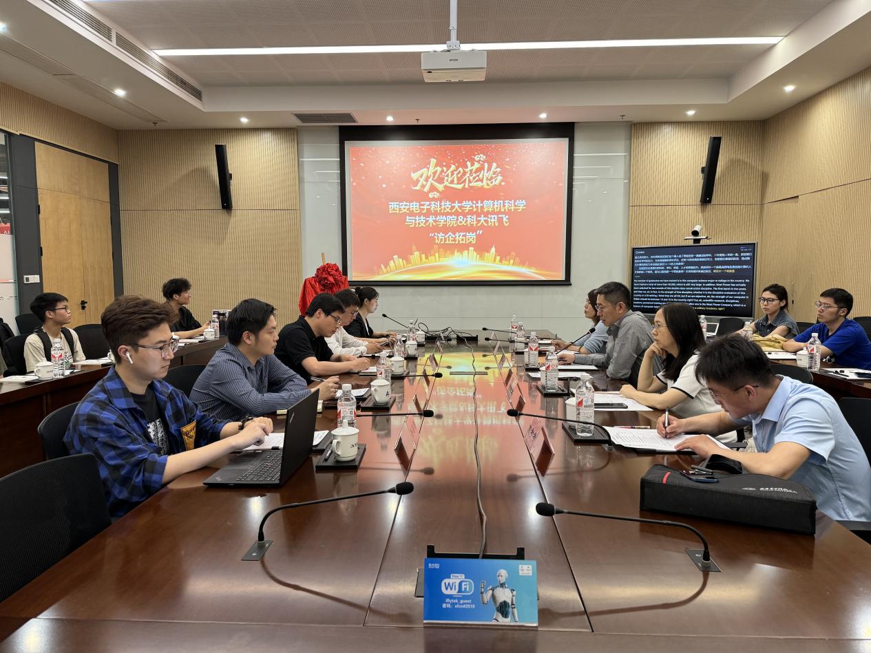 参观结束后,双方就深化校企合作,协同加强科研攻关、智能教育、就业育人等进行座谈交流。科大讯飞西安研究院副院长来意哲对计算机科学与技术学院师生一行的到访交流表示热烈的欢迎。崔江涛就学院历史沿革、专业设置、学科建设、科研师资、人才培养优势等方面做了简要介绍。他表示,科大讯飞作为高校科研成果转化的企业典范,在人工智能和计算机领域都有着卓越的成绩和贡献。学院高度重视产学研融合发展,一直持续深化与对口企业的科研联合攻关,希望下一步与科大讯飞在重大科研项目、创新人才培养等方面建立深度合作。双方还就下一步开展在AI+教育领域的合作进行了深入交流。