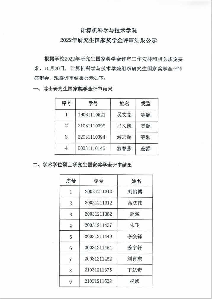 计算机科学与技术学院2022年研究生国家奖学金评审结果公示