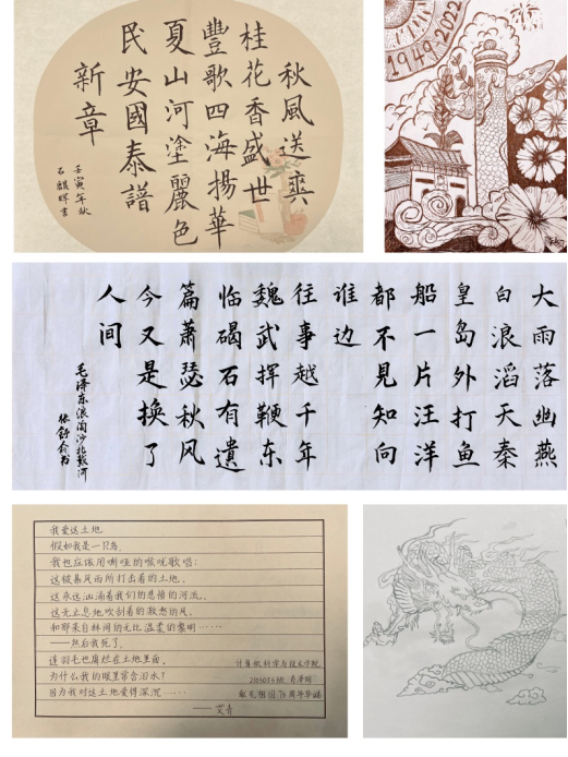 “清风送爽桂花香,盛世丰歌四海扬。华夏山河涂丽色,民安国泰谱新章。”2021级计算机科学与技术专业石麒晖同学在自己精心准备的书法作品中这样写到。围绕主题教育,学院近日举办的大学生原创文化作品征集活动得到了同学们的积极响应,一组组精彩纷呈的书画、摄影等作品展现了学子们心中的祖国风姿,彰显了学子们爱国奋斗的青春风采。