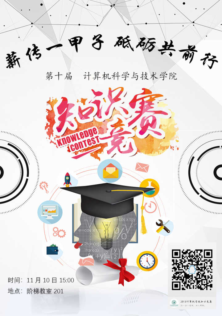 计算机科学与技术学院第十届知识竞赛来啦!本届知识竞赛以“薪传一甲子,砥砺共前行”为主题,旨在纪念我校迁校60周年,增加大家对我校校史及专业知识的了解,丰富研究生的课外活动,为大家创造一个更广阔的平台,同时使大家能够在比赛中收获快乐,收获友谊。此次知识竞赛题型多样,内容丰富,不仅有时事政治,西电历史,同时还有各种类型的百科知识,总有你可以发挥的地方。除此之外,本次知识竞赛还设有丰富的奖品及获奖证书,乐扣保温杯,闪迪U盘,卡通抱枕,各种各样的小玩偶,参与即有奖,只要你来我们就让你不虚此行。11月10日下午三点阶梯教室J201,记得带上你的室友,基友,或者那个他/她,3-5人一组,让我们一起来场头脑风暴吧!大家不见不散哦~更多详细信息,请加入计算机学院知识竞赛QQ群,群聊号码:924146808