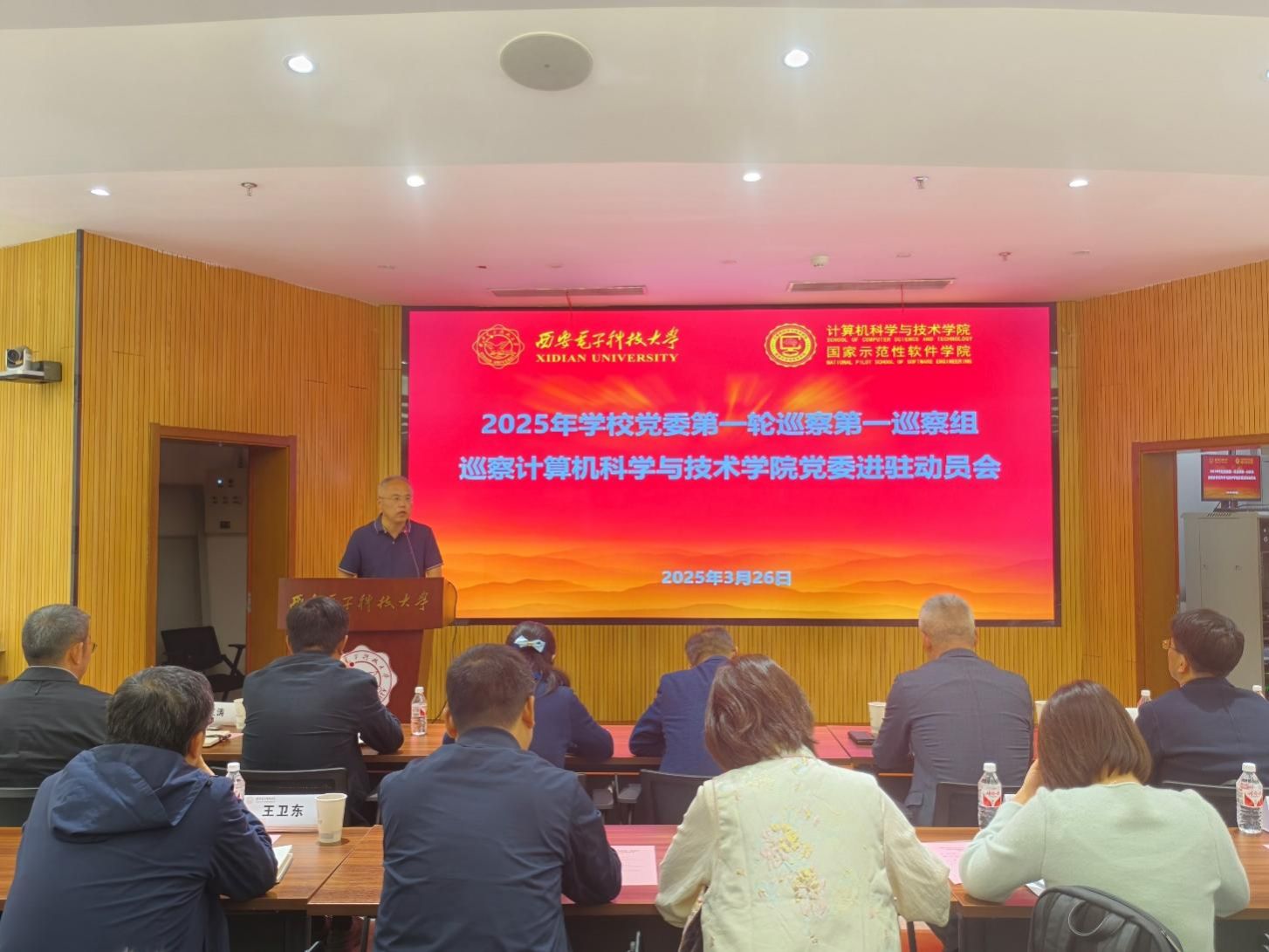 (通讯员 同榛)根据学校党委的统一部署,3月26日下午,2025年学校党委第一轮巡察第一巡察组巡察计算机科学与技术学院党委进驻动员会在网安大楼A-101报告厅召开。校党委副书记、纪委书记郭俊,巡察办负责同志、巡察组全体人员、学院党政班子成员和师生代表等100余人参加。会议由学院执行院长崔江涛主持。