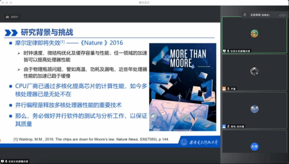 计算机网络与物联网工程研究所张晓东老师作主题为“多线程程序的约束建模与自动测试研究”的报告,张老师讲述了并行计算的需求背景,他谈到并行编程是释放多核处理器性能的重要技术,开发并行软件做好并行软件的测试与分析,已成为保证软件质量和运行效率的重要研究工作。接着,他分析了并行程序测试中线程调度的不确定性、错误执行难以复现和交织序列空间巨大等困难与挑战,并以“能否像测试串行程序一样测试并行程序”为案例具体介绍并行程序测试的研究工作。最后,他分享了多线程程序语义-时序约束模型,详细阐述了构建方法与程序示例,并展示了多线程程序前瞻性测试的研究发展情况、研究思路和相关实验结果。