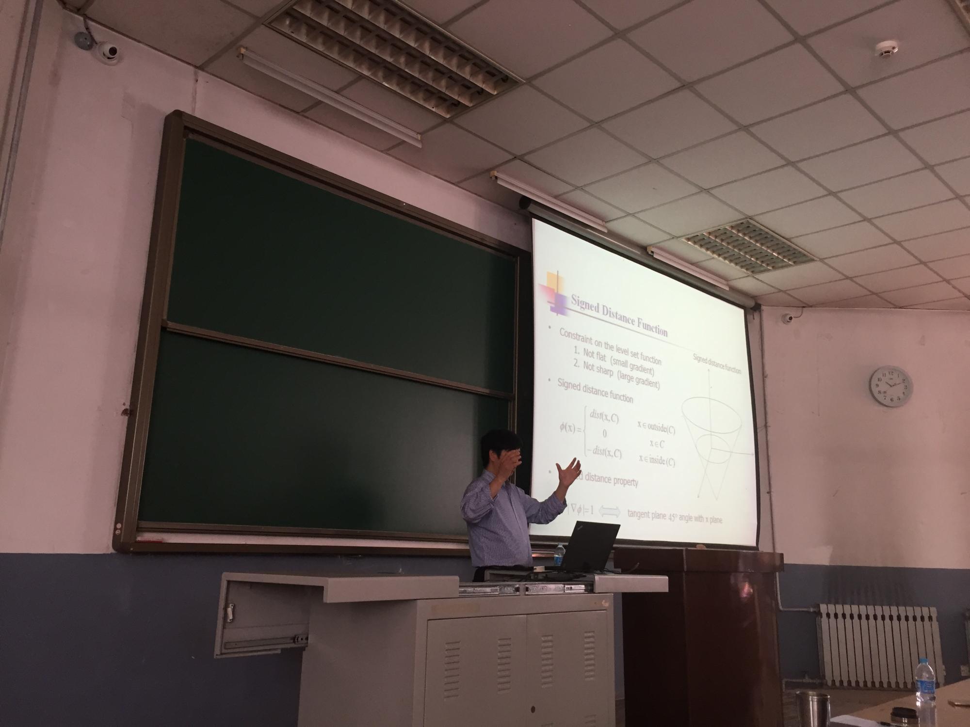 中,李纯明首先介绍了距离正则化水平集方法及其在图像分割中的应用,之后李教授分析了能够分割具有灰度不均匀性图像的水平集方法,此后又描述了能够同时分割和校正灰度不均匀性的能量极小化模型,最后介绍了基于多图谱和解剖学几何性质的大脑和心脏分割模型。李教授生动描述了水平集方法中数学公式下隐藏的物理含义,并通过视频演示解释了水平集方法的演化迭代过程。
